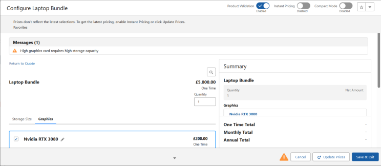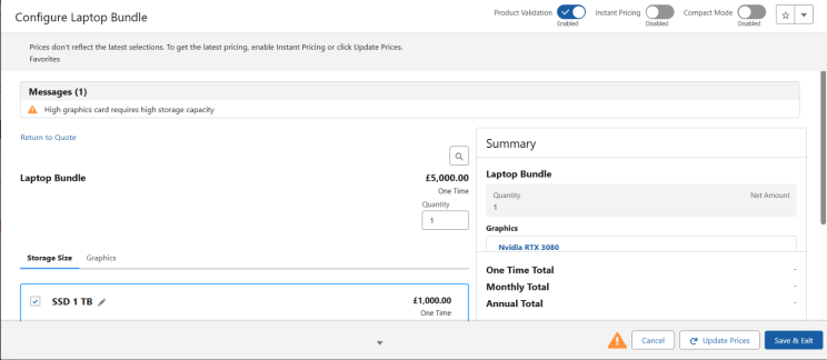 “In a Laptop Bundle configuration, when a user selects the high-end graphics option (Nvidia RTX 3080), the system should automatically switch the storage option to 1 TB and display an informational message.